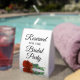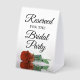 This simple tabletop sign will let your wedding guests know which areas are reserved for the bridal party. The classic timeless design features elegant script lettering and a single long-stemmed rust orange coloured rose lying on its side mirrored in a pool of water.