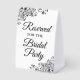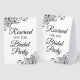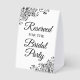 This simple tabletop sign will let your wedding guests know which areas are reserved for the bridal party. The simple black and white design features elegant script lettering with decorative curls and swirls in the corners.