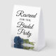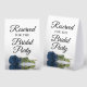 This simple tabletop sign will let your wedding guests know which areas are reserved for the bridal party. The classic timeless design features elegant script lettering and a single long-stemmed dusty steel blue or blue-grey coloured rose lying on its side mirrored in a pool of water.