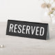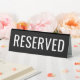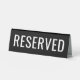 Black tabletop tent sign with white, customisable text "reserved" in big, bold letters.