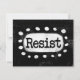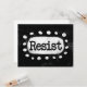 Bold text reading "Resist" is centred against a black background. The black text sits on a white rectangle with large textured white dots around it, providing a playful contrast against the solid colour backdrop.