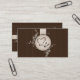 Dark chocolate brown and vintage beige chef and restaurant business card. This restaurant business card is suited for cafes, bistros, chefs, cooks, diners, and the food and drink industry. It features a circle frame with a chef's hat and a fork and knife within the frame. The frame hangs from a ribbon and is adorned by leafy foliage. The background has light transparent stripes. Customise this business card design for your restaurant.