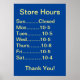 Great Sign to post in your window. Lets people know your hours. Fade resistant ink, don't waste your money on others! Totally customisable. Please "bookmark" this site, thank you. Check out some of our other great designs!