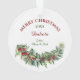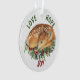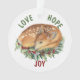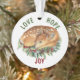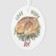 This is an adorable Christmas ornament for parents to give to a child, but it can be easily customised as a gift for anyone. The front of the ornament has a watercolor image of a little spotted deer fawn curled up on a pine bough and berry bouquet. The text around the perimeter says "LOVE HOPE JOY" in matching green and red. The back of the ornament has your custom text above the same pine bouquet.