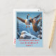 The image depicts a woman who has recently retired and she is happy because she has a lot of free time, She's jumping up as she's trying to fly together with a big goose. The surrounding atmosphere, even though is cold in the winter time, is not an obstacle to celebrate her joy. This postcard is customisable and you can change the texts as you wish.