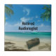 Retired audiologist, relaxing at the beach, ceramic tile.