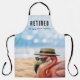 Put a smile on someone's face with this unique and funny retirement-themed apron. The design features a bright colourful flamingo wearing a hat and sunglasses on the beach with the ocean in the background. The text reads, "RETIRED... not my problem anymore." The apron is available in three size options. It is perfect for a retirement gift, Grandparent's Day gift, gift for a special relative, neighbour, friend, boss, coworker, or anyone enjoying retirement. Please browse our complete collection of flamingo retirement gifts, cards, t-shirts, home decor, and more! Special design requests accepted.