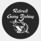 Retired! Going Fishing. White text on a black background with a white fish about to bite the bait on a hook.