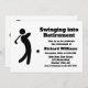 Tee up for an unforgettable celebration! Our modern, minimalistic retirement party invitation features a whimsical twist with the text 'Swinging into Retirement' alongside a graphic of a golf player in full swing. It's the perfect customisable invitation for golf enthusiasts bidding farewell to the office. Personalise the details and let the festivities begin!"