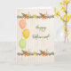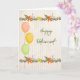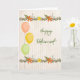 Cheerful retirement card with balloons and flowers on a beige background. The flowers are orange and yellow and the balloons are pink, yellow and green. Thanks to Design Cuts and the Hungryjpeg for some of the elements in the design.