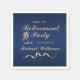 Celebrate a distinguished career with our Elegant Formal Retirement Party Napkin! Featuring "Retirement Party" in a graceful script font, this design includes two golden champagne glasses against a sophisticated blue background. The text is elegantly highlighted in golden shades, with a stylish curly ribbon between the details. Perfect for family or corporate organizers, this customisable invitation allows you to easily add name making it a comprehensive choice for a memorable send-off.
