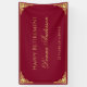 The background is burgundy. There is a golden frame with vintage faux gold decorations in the corners. The name is written in elegant calligraphic script, the rest in caps. All text is golden.