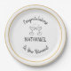 Add extra style to your retirement party tables with these custom paper plates. The plates display the message 'Congratulations On Your Retirement' in script typography, and can be personalised with a name. Two elegant glasses of sparkling champagne are pictured for a celebratory look. The design is mostly white, with black text and a double faux gold band around the edge.