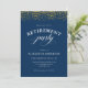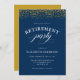 This retirement party invitation offers a stylish design accented with elegant script and gold glitter confetti on a navy blue background.