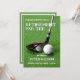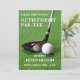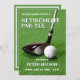Retirement Party Invitation for Golf Lovers. Gather friends and family to celebrate a special retiree with this Retirement Party Invitation designed with a golf club and golf ball on a green golf turf background. The front side includes the text: Please Join Us For A Retirement Par-Tee, The Name, The Date and Time. The reverse side text includes: The Location Name, Address, and RSVP details, decorated with a white golf cart and green border on a white background. To personalise, simply insert your event details into our easy template replacing the sample text. This Retirement Invitation is available in both print or download.