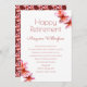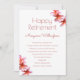 Pink plumeria flowers retirement party invitation for a woman. White template with pink Hawaiian flowers, called plumeria or frangipani. The pretty, realistic flowers decorate the corners of the card at top and bottom. They are light pink to darker pink and orange centres. Text colour is dark pink-red. Reverse has a floral pattern. Upgrade the paper as you prefer.