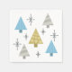 A festive mid century modern art design with atomic age style christmas trees in gold, silver and light blue, and starbursts.