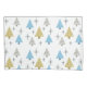 A festive mid century modern art design with atomic age style christmas trees in gold, silver and light blue, and starbursts.