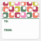 These stick on gift tags have a retro 1970s style with a geometric pattern in red, pink. lime green, orange and green on white. They have a spot for you to write in your own names.
