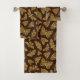 This bath towel set features retro moths with flowers on their wings in popular colours from the 1970s such as orange and olive green.