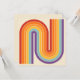 This artwork channels a retro graphic spirit, forming the letter‑like curve with parallel bands of red, orange, yellow, light blue, teal, and purple. The layered arcs flow in harmony, evoking the bold optimism of 1970s design. Set against a soft beige background, the vibrant rainbow palette stands out with clarity and rhythm. The composition balances simplicity and dynamism, creating a timeless visual that feels both nostalgic and modern.