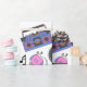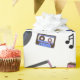 Retro blue and pink Vinyl Records, boomboxes, video gaming and cassette tapes birthday gift wrap.