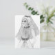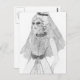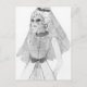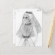 Black and white pencil sketch of a Retro 70's Bride with veil and wedding dress with a stylish updo adorns this postcard.