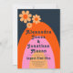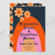 Bring some simple bold stylish groovy floral 70s vintage fun with a modern twist to your wedding with this 1970s minimalist floral wedding invitation. Cool retro vintage daisy rainbow arch design in apricot orange tangerine, pink, mustard yellow and Navy Blue with groovy typography script which is easy to personalise using the simple templates. Ideal for setting the tone for a summer spring or autumn wedding. Original artwork by artist Catherine Sweetman