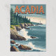 A retro-style coastal nature poster for Acadia National Park features rugged cliffs, crashing ocean waves, and a distant lighthouse, framed by lush pine trees under a textured sky. "ACADIA" is boldly displayed at the top.