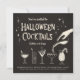 This Halloween party invitation shows a hand pouring a drink into a set of spooky Halloween themed cocktail glasses with spider webs, stars and moons. This illustration is a retro kitsch style in cream on a textured black background. This would be perfect for anybody hosting Halloween cocktails or an adult Halloween party.