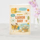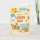 This cheerful Labor Day design blends playful mid-century Atomic Age style with warm, handmade charm. Set on a lightly textured cream background, bold retro typography announces “Happy Labor Day” amid colorful geometric shapes, starbursts, and atomic motifs. Thoughtful details—crossed tools tied with rope, a woven basket of daisies, and seaside accents like shells and a starfish—symbolize both the effort of work and the joy of rest. The lively color palette of teal, mustard, orange, and soft neutrals gives the artwork a fun, optimistic feel with a modern-vintage vibe.
