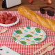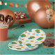 These Retro Atomic Mobile Pattern Paper Plates are mid century modern style at its finest. The vintage inspired design features a cream background with colourful pointed ovals in turquoise, orange, teal, and avocado green. The teal and avocado green ovals overlap creating a lovely shade of peacock blue. Fun starbursts accentuate slanting and straight lines, which connect the shapes forming a kitschy mobile pattern. This mod design pairs exceptionally well with StrangeLittleOnion’s Retro Grid and Starburst products.