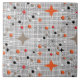Stylish on trend pattern inspired by retro modern mid century designs with atomic starburst shapes on a white basket weave in tones of orange, grey, black and white