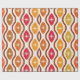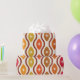 This is elegant mid century modern atomic starbursts pattern placed on colourful ogee ovals between wavy shapes in orange, yellow, red and brown.