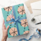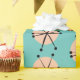 Fun retro pattern features black mid-century atomic stars graphic on pink disc with light blue background
