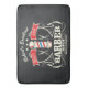 Barbers and stylists will appreciate this old fashioned and retro style Barbershop work floor mat. Place at your work station and show off your style. Features an old fashioned stripe barber pole, scissors, razors. Have fun creating a monogram gift for your favorite barber. Gray background with white,red and blue colors.