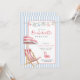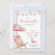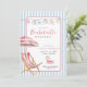 Cute retro modern pink and blue Bachelorette or birthday weekend invitation featuring simple and inviting watercolor beach chair and umbrella.