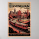A vintage-inspired travel poster illustration showcasing Birmingham, Alabama, rendered in a style reminiscent of 1920s Art Deco posters. The scene features a stylised depiction of the Birmingham skyline, including iconic buildings like the Red Mountain Inn, with a winding road leading towards the city centre. A vintage passenger train, coloured in deep red and beige, gracefully curves along the tracks in the foreground, creating a sense of motion and adventure. The poster features the words “VISIT BIRMINGHAM” in a classic serif font at the top, while a smaller caption at the bottom reads "The Magic City of the South" in a similar style, all set against a background of muted sepia tones and subtle cloud patterns.