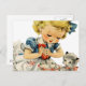 Little Girl and the Cake - A retro birthday card from the 50s with a little girl decorating a cake with her little kitty cat.