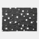 This image features a modern, abstract geometric pattern in black and white. It consists of various-sized squares and rectangles arranged randomly across a black background. Some shapes are solid white, while others are outlined, creating a layered effect. Small dots and pixel-like elements are scattered throughout, adding depth and texture. The overall design is minimalistic and conveys a digital or futuristic aesthetic.
