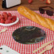 Atomic swirl, 50s space age, mid century modern retro pattern. Black with purple, blue, yellow colour swirls.
