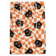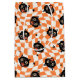 This vintage-inspired pattern features charming black cat faces with large, wide eyes and open mouths, giving them an expression of surprise or excitement. The cats are set against a vibrant, retro orange and cream chequered background with a wavy, distorted effect, evoking a sense of playful movement. Small black stars are scattered throughout the design, adding an extra element of whimsy and nostalgia. The combination of the classic Halloween colours and the bold, stylised cat faces creates a fun, slightly spooky aesthetic that harkens back to mid-century vintage design.