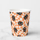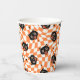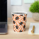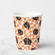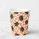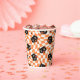 This vintage-inspired pattern features charming black cat faces with large, wide eyes and open mouths, giving them an expression of surprise or excitement. The cats are set against a vibrant, retro orange and cream chequered background with a wavy, distorted effect, evoking a sense of playful movement. Small black stars are scattered throughout the design, adding an extra element of whimsy and nostalgia. The combination of the classic Halloween colours and the bold, stylised cat faces creates a fun, slightly spooky aesthetic that harkens back to mid-century vintage design.