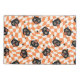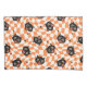 This vintage-inspired pattern features charming black cat faces with large, wide eyes and open mouths, giving them an expression of surprise or excitement. The cats are set against a vibrant, retro orange and cream chequered background with a wavy, distorted effect, evoking a sense of playful movement. Small black stars are scattered throughout the design, adding an extra element of whimsy and nostalgia. The combination of the classic Halloween colours and the bold, stylised cat faces creates a fun, slightly spooky aesthetic that harkens back to mid-century vintage design.