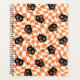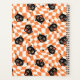 This vintage-inspired pattern features charming black cat faces with large, wide eyes and open mouths, giving them an expression of surprise or excitement. The cats are set against a vibrant, retro orange and cream chequered background with a wavy, distorted effect, evoking a sense of playful movement. Small black stars are scattered throughout the design, adding an extra element of whimsy and nostalgia. The combination of the classic Halloween colours and the bold, stylised cat faces creates a fun, slightly spooky aesthetic that harkens back to mid-century vintage design.