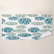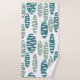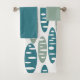 This towel set has a bath towel with a repeating pattern of ovals in retro blue with scattered white ovals all on a field of white, a light blue washcloth, and a darker blue hand towel.