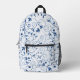 This retro style backpack features a delicate blue leaf swirl design on a white background. A pale blue shadow of the pattern gives added interest in the background. Your monogram is in matching blue script on a white circle banner at the centre of the pocket.