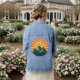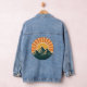 Bold retro vibes meet adventure energy. This wanderlust design features sun-drenched teal blue mountains and vintage-inspired rays from the golden orange sunrise. The bold graphic is printed on the back for maximum exposure. Made for travelers, hikers, dreamers, and anyone who feels most alive chasing the next horizon. Show off your love for the outdoors while adding good vibes to your outfit with this wearable art denim jacket