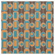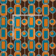 Orange and blue rectangles and circles on a brown background are inspired by retro patterns.