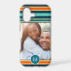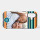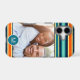 Striped monogram photo case using a classic blue and orange retro color palette. The color of the stripes and monogrammed circle can be changed.